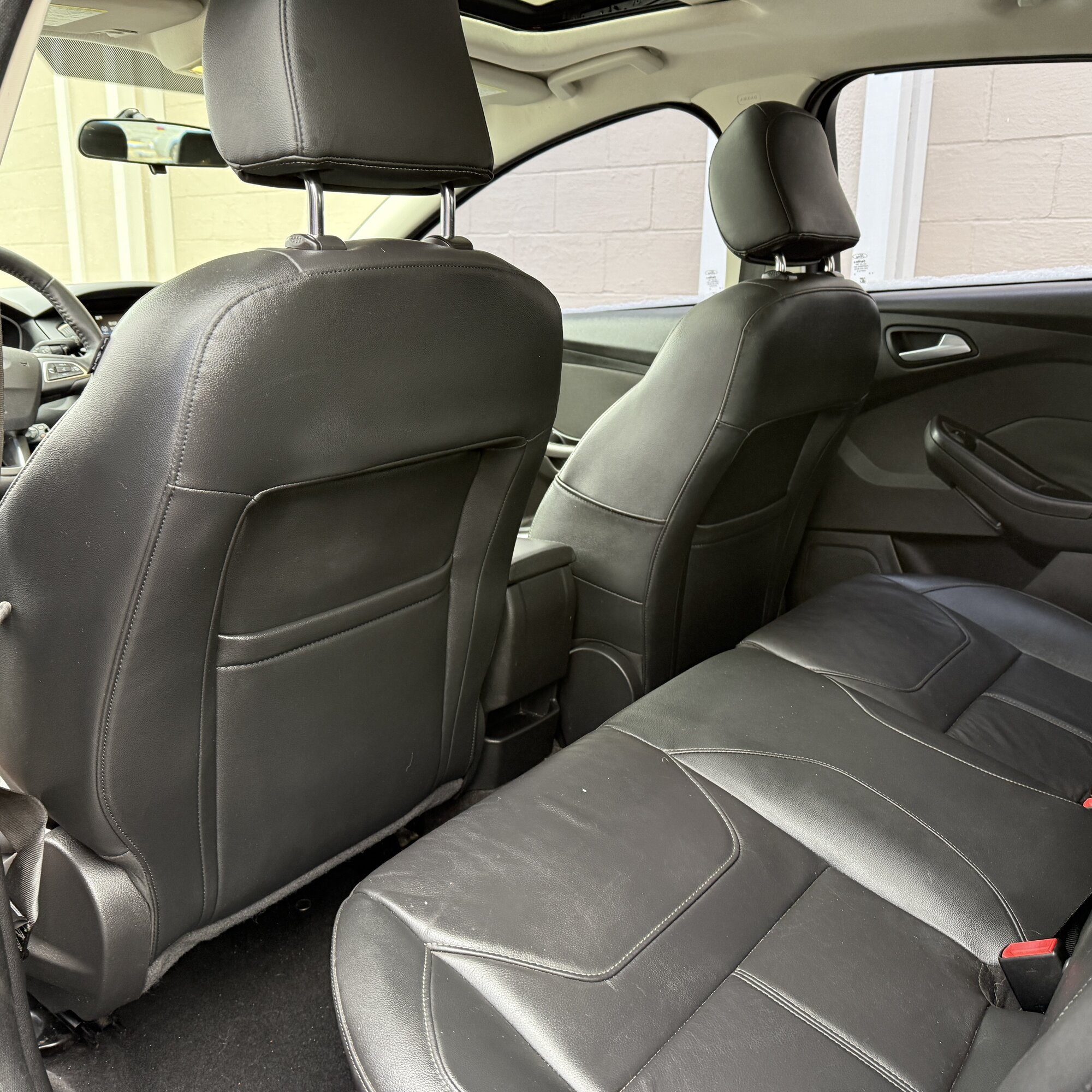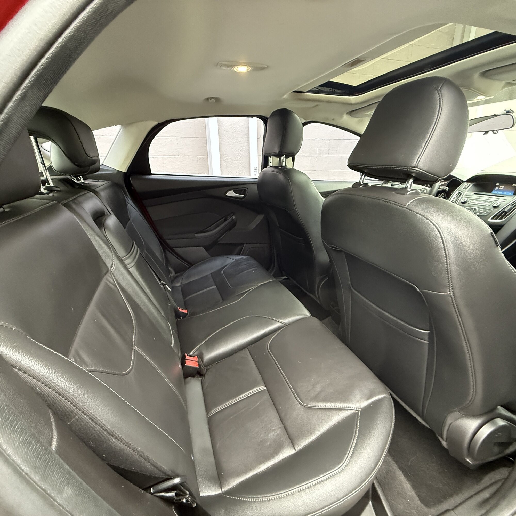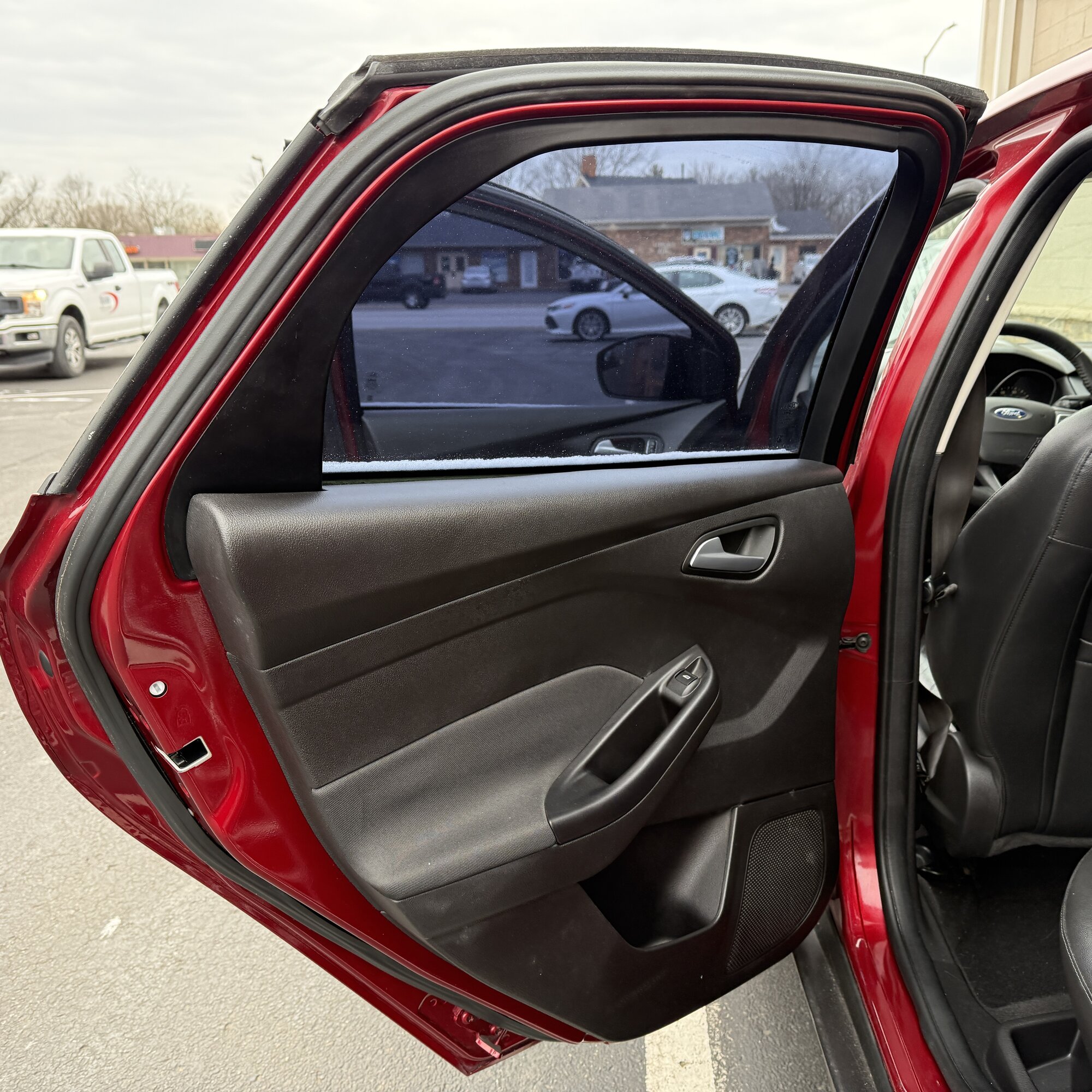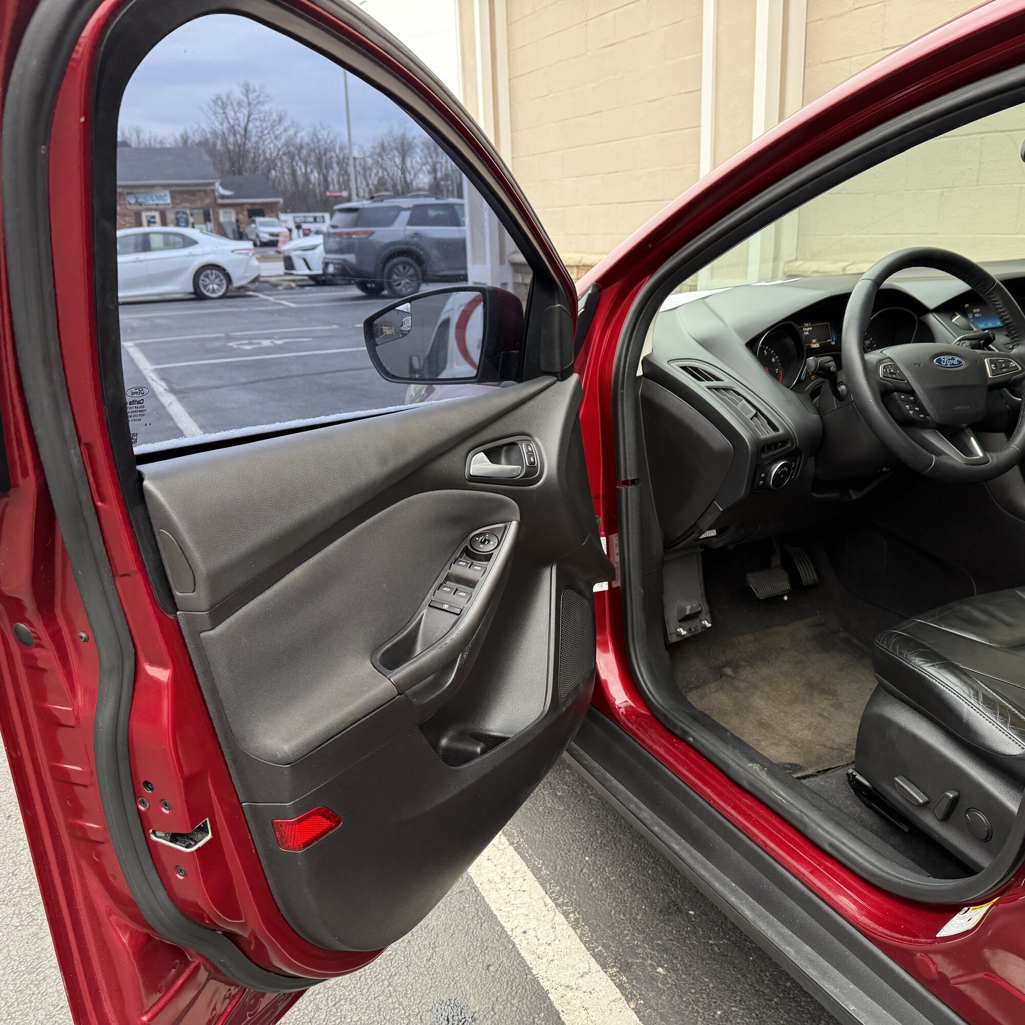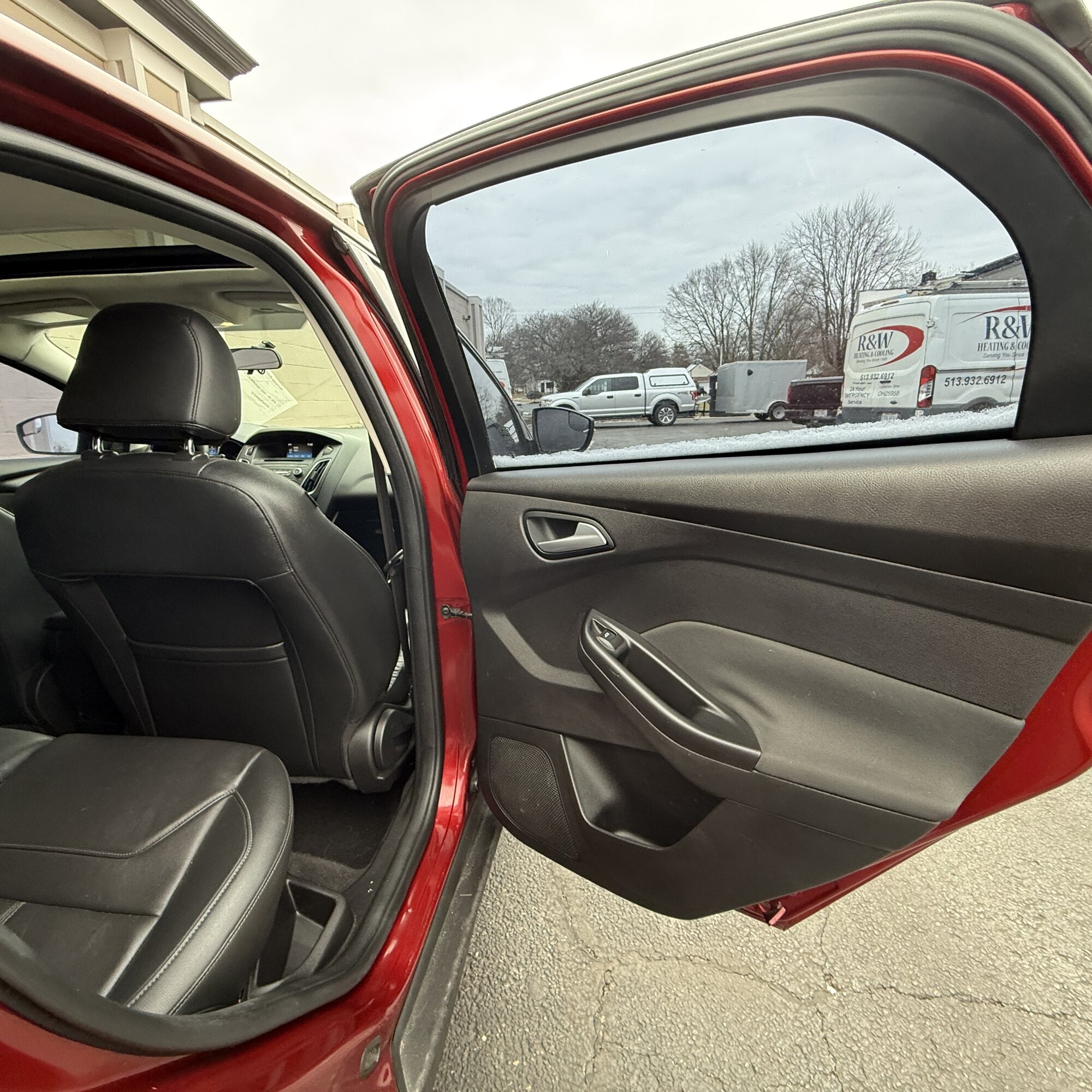 This 2015 Ford Focus SE Hatchback is a sporty and fuel-efficient compact car with only 58,000 miles. Finished in an eye-catching maroon exterior with black leather interior, this Focus offers premium features including a power sunroof, keyless entry, and power driver's seat. The 2.0L 4-cylinder engine provides excellent fuel economy while the hatchback design offers versatile cargo space. A great choice for commuters or anyone looking for a stylish, practical vehicle.